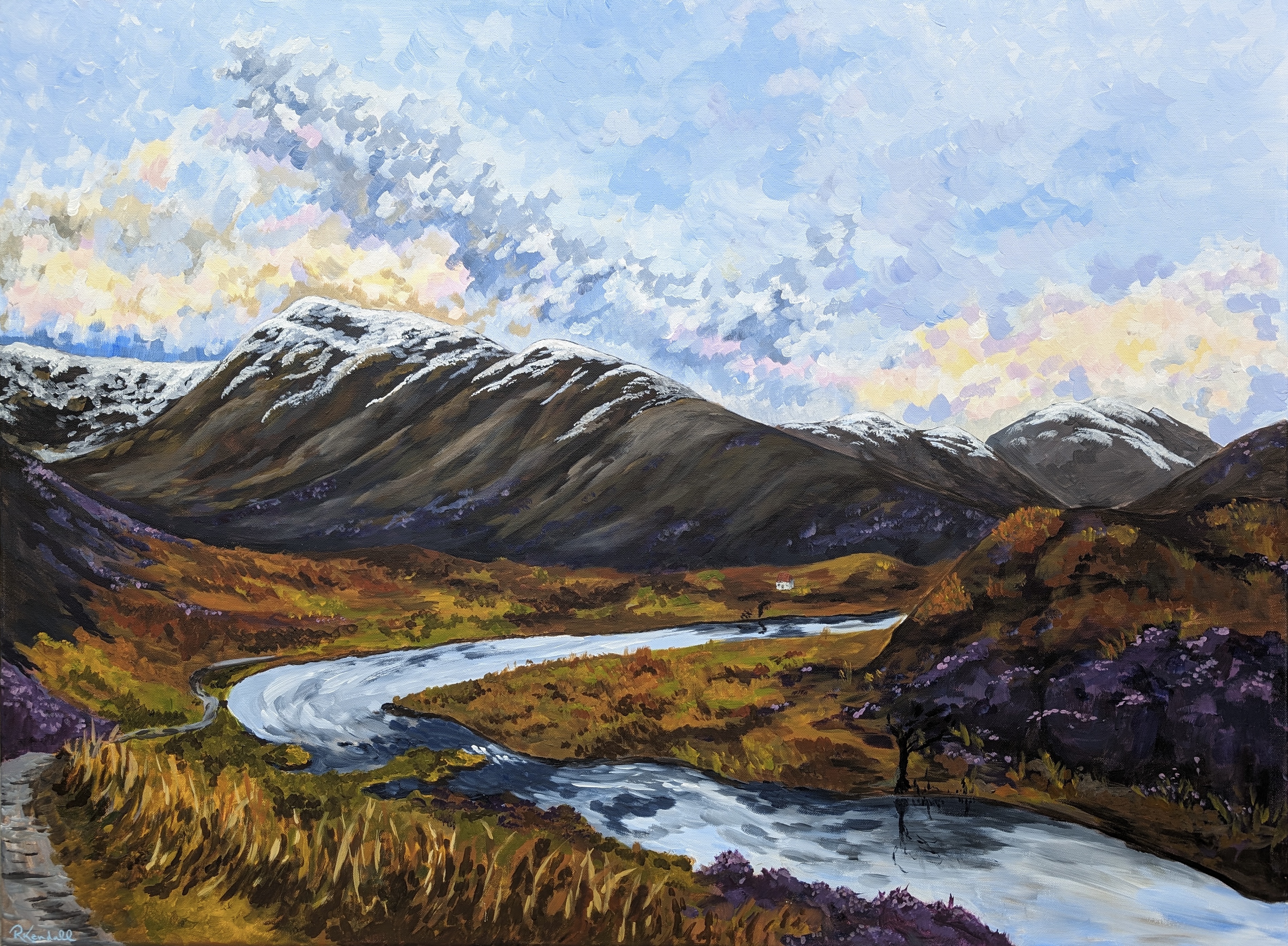 Painting Scottish landscapes is a way for her to immerse herself in the beauty of her homeland; capturing fleeting light across a hill, snow on mountain tops, or the flowing movement of water.
